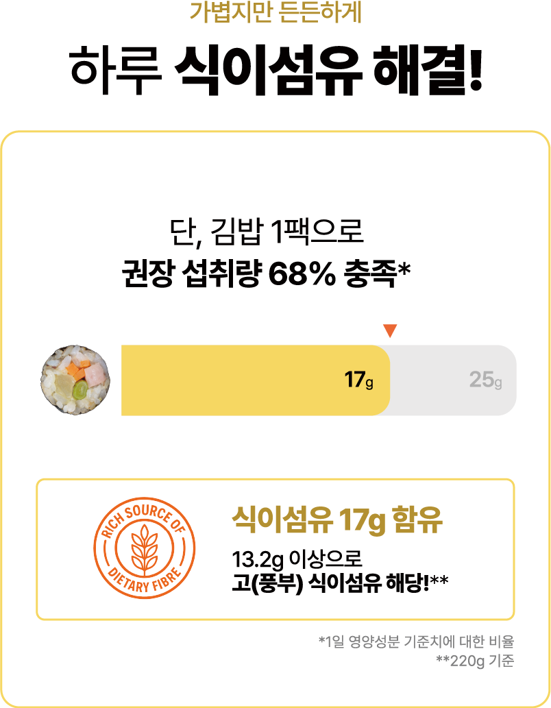 복만사의 기술력으로 완성된 이 제품은 낮은 칼로리와 저당 설계로 부담 없이 즐길 수 있으며, 하루 권장 식이섬유를 충분히 제공해 영양균형을 유지하면서 건강한 라이프스타일을 위한 스마트한 식단을 완성합니다.
